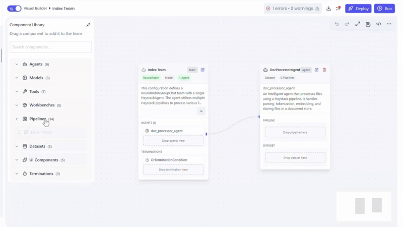 - Pipelines are dragged and dropped onto the DocProcessorAgent